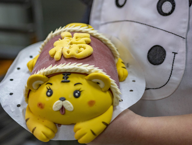 在河南省三门峡市灵宝建设村,花馍制作师周园园展示虎形花馍。虎年春节临近,不少地方的面点师傅纷纷推出各式各样的虎型花馍,受到消费者青睐。