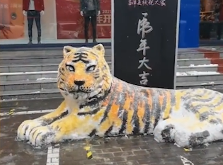 ·河南洛阳一对父子花4小时堆出雪老虎:一家都学美术,要做就做个逼真的。